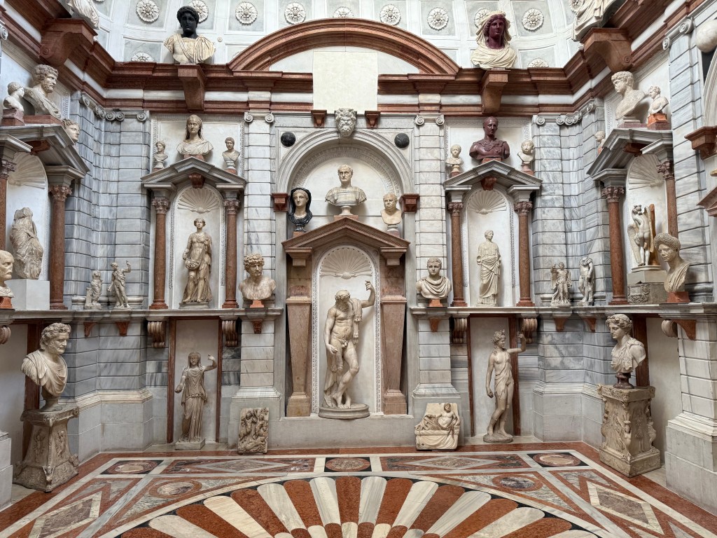 Il nucleo centrale del palazzo però è la Tribuna Grimani, luogo di grande fascino, pensato per assorbire la luce naturale e indirizzarla sulle straordinarie sculture antiche raccolte al suo interno: busti, statue, teste, bronzi protetti al centro del lungo soffitto dal “Ratto di Ganimede”, che attira su di sé le attenzioni dei visitatori e dei fotografi, donando a questo spazio una dimensione aulica.