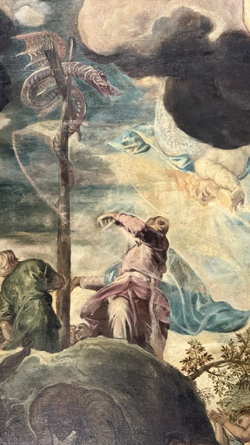 Altro capolavoro assoluto è il “Miracolo dello schiavo”. Questa tela, di dimensioni immense (4,16 ×5,44 metri), è conservata alle Gallerie dell’Accademia: la scena racconta di uno schiavo di fede cristiana che viene torturato dal suo padrone perché sorpreso a pregare sulla tomba di San Marco (la tortura prevedeva l’accecamento e la frattura delle gambe). Così interviene miracolosamente il santo che fa spezzare gli strumenti della tortura e salva lo schiavo. Quando l’ho scoperta mi ha riportato subito ad un caro amico: lo rivedo in quel San Marco che scende dall’alto, che porta genialità ed ascolto nelle persone con le quali si rapporta. I colori e la luce come su S.Marco spiccano e sono d’ispirazione alle persone “nude” che stanno intorno.