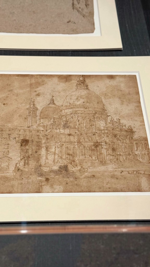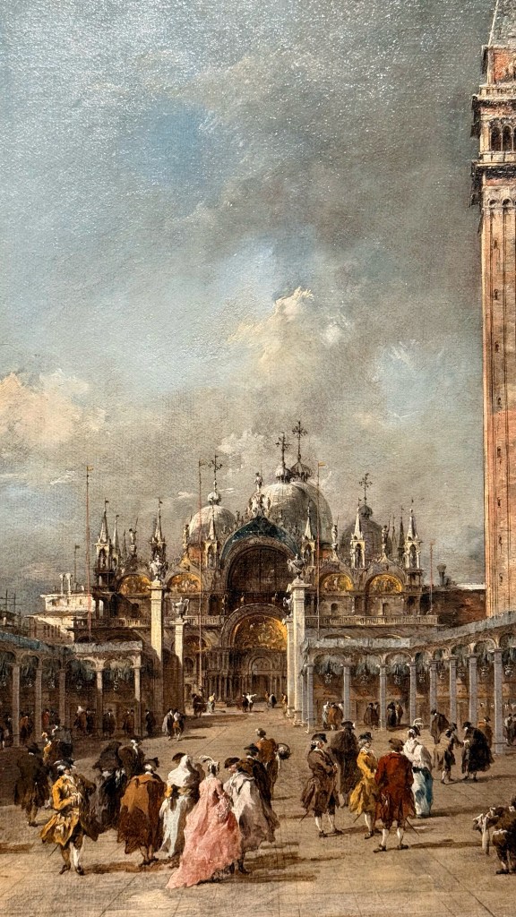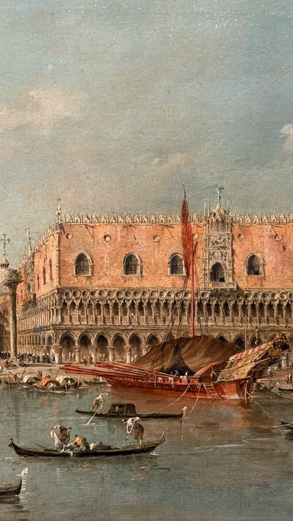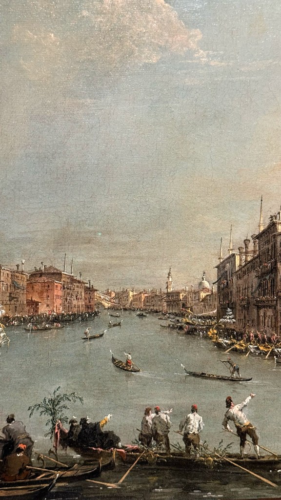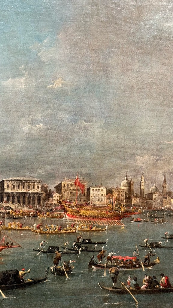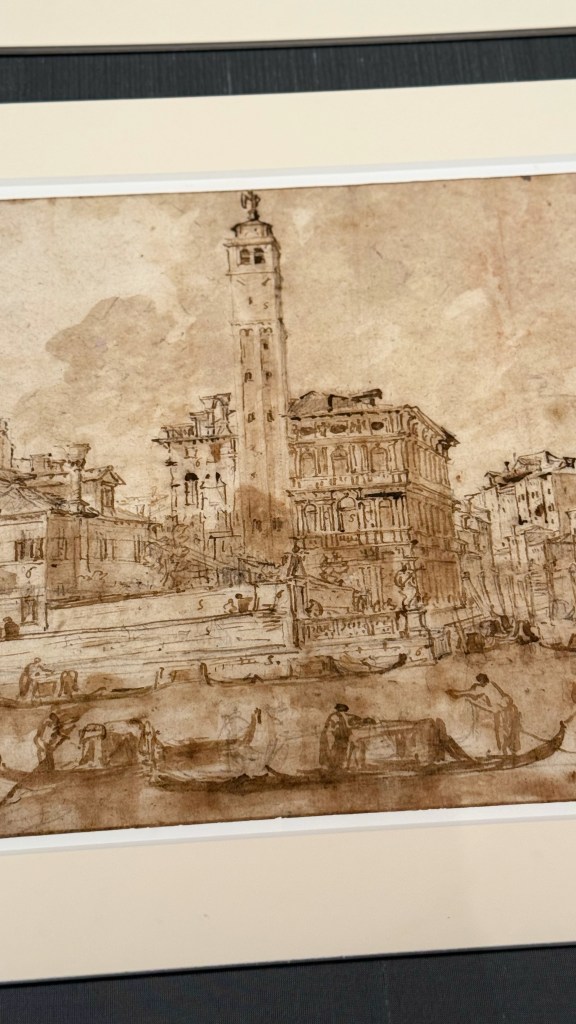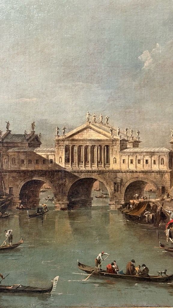 Tra i soggetti rappresentati compaiono scene emblematiche della vita veneziana: feste e cerimonie pubbliche in Piazza San Marco, regate sul Canal Grande, il Bucintoro e le celebrazioni della Serenissima, ed uno straordinario progetto per il Ponte di Rialto realizzato da Andrea Palladio. La mostra non si limita a presentare dipinti provenienti da Lisbona, ma li mette in dialogo con disegni di Guardi conservati nelle collezioni civiche veneziane, in particolare nel Gabinetto dei disegni e delle stampe. Questo confronto permette di comprendere meglio il processo creativo dell’artista e il passaggio dal disegno alla pittura.